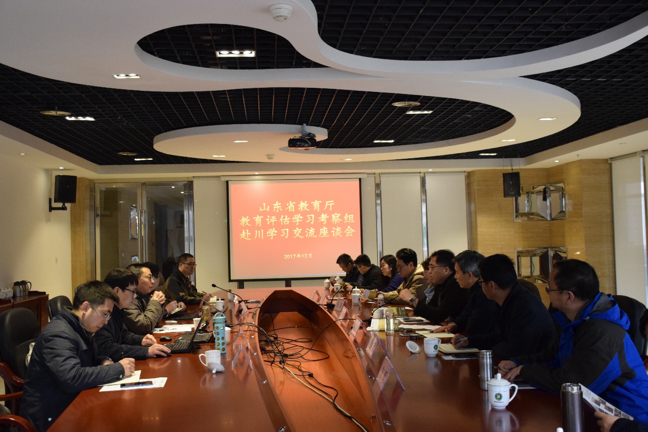 12月14日,山东省教育厅教育评估学习考察组一行10人在山东省教育厅综合改革处高洪波副处长的带领下抵达四川省教科院,就教育监测评估、科研信息资源平台建设等工作进行了交流考察。四川省教科院副院长、省基础教育监测评估中心副主任曾宁波首先代表四川省教科院对山东省教育厅教育评估学习考察组来我院交流指导表示热烈的欢迎,并陪同考察组一行实地参观了我院教育科研成果展列室和办公场所,重点介绍了我院实施全员公开竞聘上岗、推进教科研机构改革转型升级发展的相关情况。教育监测评估研究所所长赖长春、教育科研信息中心主任郭斌与学习考察组成员就教育评估监测、教育质量综合评价、教科研信息资源平台建设与应用等问题进行了深入交流研讨。