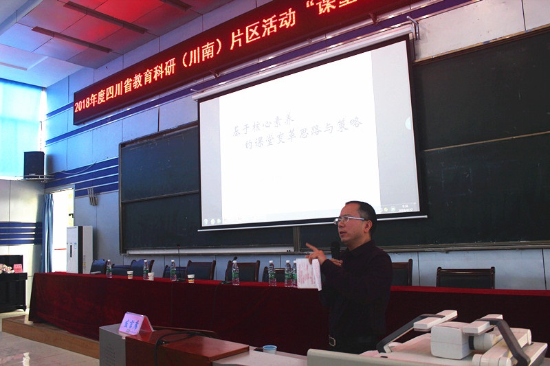 主会场展示了资阳市《“区域推进“三环五学”高中课堂教学模式”》和自贡市《提高农村高中语文课堂小组合作学习有效性的策略》成果。四川师范大学张伟教授点评并做专题学术报告——《基于核心素养的课堂变革思路与策略》。张教授从课堂变革的关键词、基于核心素养的课堂变革思路、突破实践改革关键点的主要策略几方面为破解课堂变革难题;强调从改革意识、学术涵养、执着追求、持续改变四方面扎实做好教育科研。讲座既高屋建瓴,又结合案例深入浅出,与会者纷纷表示受益匪浅。