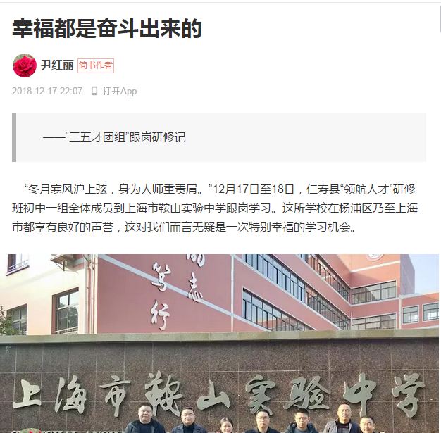 12月14—20日,由四川省教育科学研究院承办的院地合作项目“仁寿县教育管理‘领航’人才上海研修”活动在上海顺利举行,来自仁寿县的40名教育管理“领航”人才参与了研修活动。