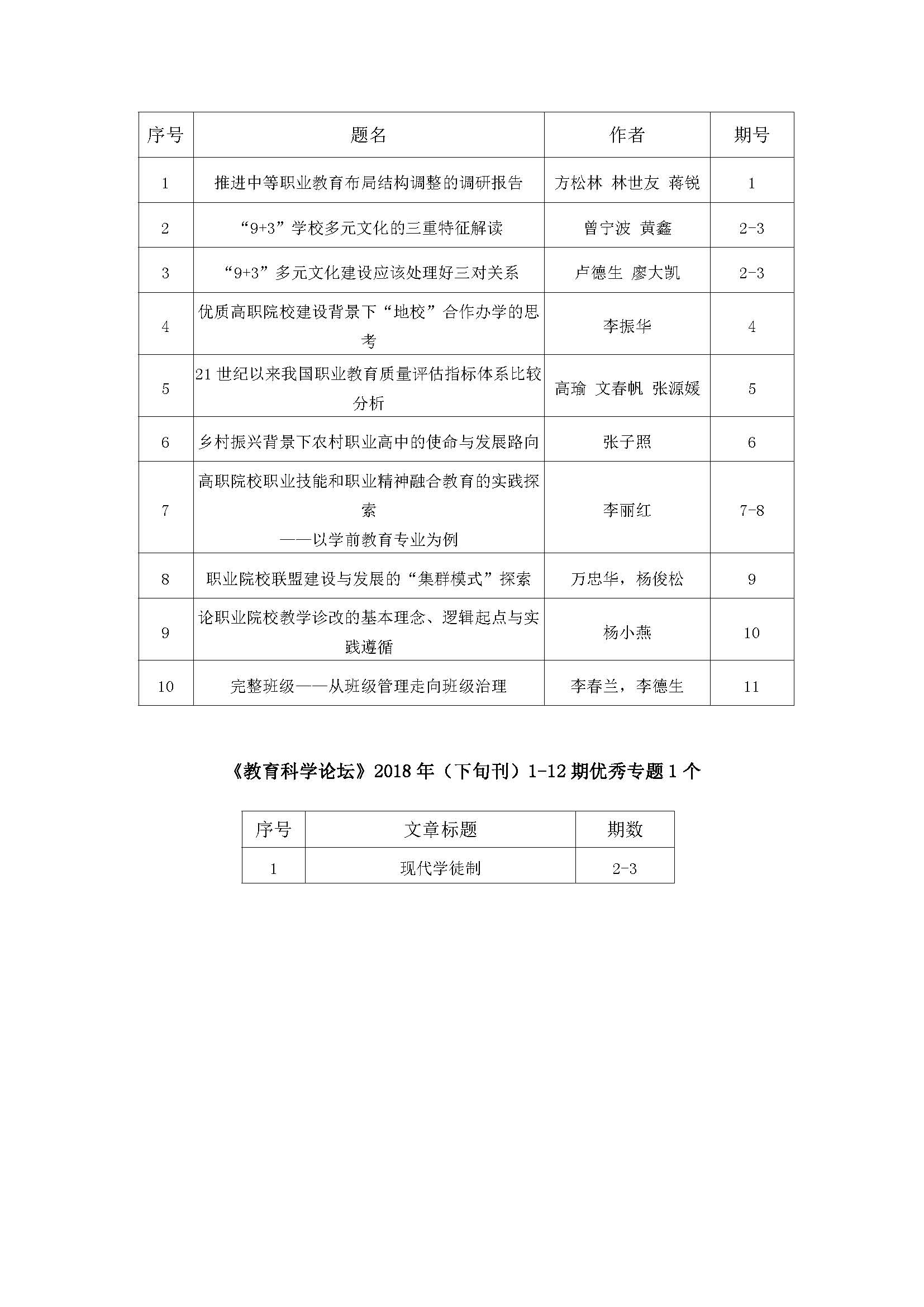 您的位置: 首页 >工作动态>新闻动态>详细内容 新闻动态 2018年《教育科学论坛》人大书报资料中心复印和年度优秀文章汇总 来源: 发布时间:2019-01-03 15:45:20 浏览次数: 次 【字体:小 大】 截至2018年12月31日,《教育科学论坛》2018年文章被人大书报资料中心共计全文复印41篇(已收到样刊35篇),索引105篇。编辑部聘请专家团队评选出年度优秀文章60篇,优秀专题6个。名单如下: 分享到: 【打印正文】