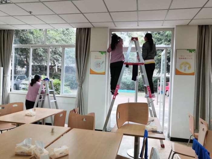 参与人员按照新冠肺炎疫情防控相关要求做好个人卫生防护后按照统一安排开展了清扫路面垃圾、冲洗浮尘、擦拭门窗玻璃、清理堆放的各类杂物、疏通阴沟下水道等工作。对包括办公区、职工食堂、地下车库、职工宿舍、卫生间、运动场、小区道路等公共区域进行了彻底的大扫除。针对职工食堂等重点区域,工作人员及时处理了过期变质的原辅材料,对操作间厨具设备、餐厅的地面和桌椅板凳等进行了全面清洗消毒,对食堂周边的地面污水油垢进行了清除冲刷,同时还对一些卫生死角里的垃圾、杂物进行了清扫和清运。