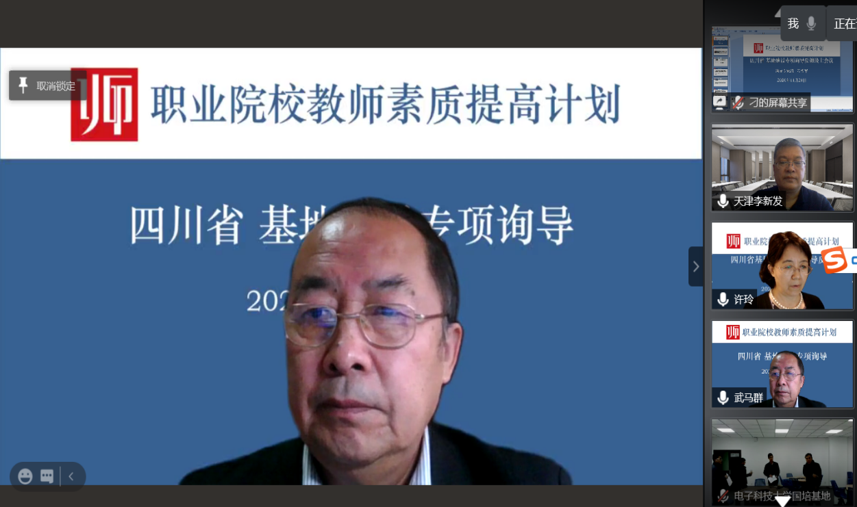 11月24日下午,教育部专家组对我省职业院校教师素质提高计划基地建设工作进行了专项询导。专项询导以在线方式举行,会议由专家组组长河北师范大学刁哲军教授主持。厅人事教师处处长寇昆仑、职教处副处长陈明政,省项目办、电子科技大学、四川农业大学、成都工业职业技术学院、四川长虹电器集团股份有限公司等国家级重点职教师资培训基地相关工作负责同志及管理人员参加询导会议。