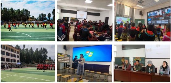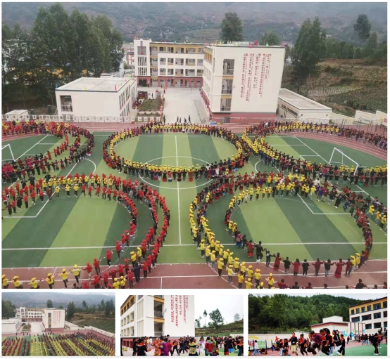 首先展示的是大课间体育活动,由于昭觉县有98%以上的师生都是彝族,在设计大课间体育活动时,设计团队将大课间体育活动内容与彝族风俗活动等内容相结合,以此理念设计的大课间体育活动既能激发师生参与到大课间体育活动中,又能体现民族特色,这是城市学校无法实现的具有民族特色的大课间体育活动。同时,也丰富了四川省教科院承担的2020年度四川省教育学会立项的重点课题——“大课间体育活动高效实施策略研究”内容。大坝乡中小学校新校区四至六年级22个班级1380名师生及学校后勤等行政人员全员参与,本次大课间体育活动总展示了40分钟的时间,采用“总—分—总”的模式进行展示,即先进行了集体跳2段具有彝族特色的舞蹈《阿诗且》和《达体舞》,接着根据各年级教学内容和民族特色体育运动项目,分班级在不同场地由体育教师、班主任及其他学科的任教教师共同组织进行体育美术等社团展示;最后再进行集体放松活动。