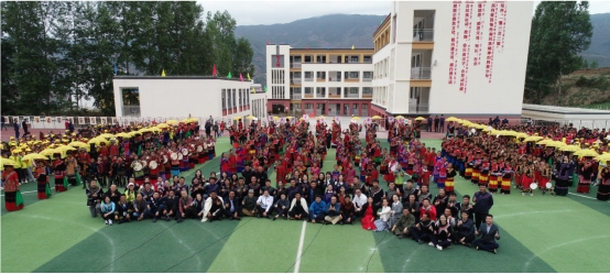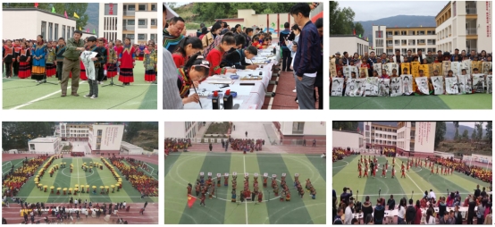无论是大课间的《五环达体舞》,即通过服装展现中国共产党人(代表“党旗”和“100字样”服饰的学生)和民族同胞(彝族服饰学生)完全融入一体,书法、美术教材内容的选择,还是舞蹈、合唱等社团建设,都融入了大量的“红色教育”和“民族文化”题材,全面展现了“彝海结盟” “彝汉一家亲”“民族大团结”的精神,更是充分体现了为党育人,为国育才的教育方针。