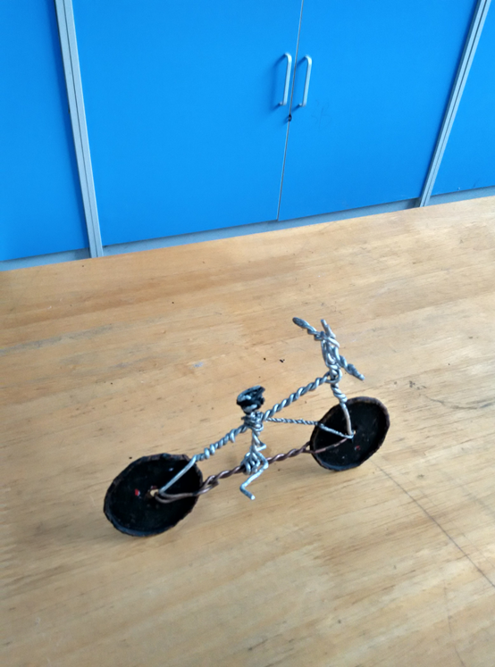 1.绘制草图 用草图把设计思路变成一种可以与别人交流的直观形式,用图形传达物体的尺寸.形状和功能. 2.材料准备 选取硬度不大,易于变形的铝丝,铜丝,铁丝中的一种或几种各50cm至100cm; 选择圆形的铁片或者光盘、塑料盘一对; 3.工具准备 图纸、铅笔、直尺、手套、手摇钻、尖嘴钳、剪刀、打孔机、护目镜(备用)、电烙铁、螺丝刀等 制作过程 ⑴根据教材的内容,画出该自行车教具的模型草图、三视图;并根据大小标注具体长度,精确到cm。 ⑵制作自行车教具模型的主框架,用切割好的铝丝根据图纸完成,带有一定的强度便于成型。 ⑶如果是选择的废旧光盘则无需打孔,若是铁片或者塑料盘,用打孔机在圆心位置打出与铝丝厚度相对匹配(即能穿过铝丝)的圆孔,用于制作自行车教具车轮。 ⑷完成组装,即按照图纸尺寸大小完成车架、中轴、脚架等部分制作,并打磨边缘。 5.收拾工具,清理材料,安全摆放。 |