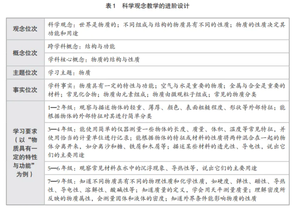 表1以学科核心概念中的“物质的结构与性质”为例,呈现了科学观念培养的进阶模式。科学观念教学的进阶设计表明:第一,学生的科学观念及素养发展不是凭空而来的,而是在“学科核心概念”与“主题内容”的学习与实践活动过程中,学生通过内化、升华而逐渐形成、发展起来的。第二,立足科学观念的素养目标,将“科学观念”置于最上位,如“世界是物质的”“不同组成与结构的物质具有不同的性质”“物质的性质决定其功能和用途”等,都属于观念要素。然而,科学观念的形成不是一蹴而就的,要经历由浅入深、逐渐复杂的概念理解过程。具体的教学实施,要围绕学科核心概念(物质的结构与性质)及跨学科概念(以“结构与功能”为例)进行。于是,可开发与设计“物质”的主题(或单元)学习内容,让学生接触与物质相关的“学科事实”,如空气与水、金属与合金等,借助学科事实,学生要建立与概念理解的关系。此外,教师要对照学段目标,明确学习要求和设计学习任务,如观察、描述现象,使用仪器测量,说出性质、特征与用途等。第三,从学段特征上,能够揭示科学观念发展的进阶水平。例如:在1—2年级,科学教学活动重在引导观察物质与物质现象,学习简单的科学事实,以及在此基础上形成一些低层次的观念;3—4年级要求借助一些简单的仪器测量物质的表征,如长度、质量、体积和温度等,并在探究实践活动中会使用恰当的计量单位进行记录,形成“自然现象是有规律的”的科学观念;5—6年级开始能够抓住事物的本质特征,形成“自然现象是可以被认识的”的科学观念,并开始有意识地去解释现象发生的原因;7—9年级形成“自然规律是可以通过多种方法被发现的,还可以预测自然现象”的科学观念,此时的学生对科学事实的认识更加深刻,能够抓住事物的本质特征,从而形成较高层次的科学观念。