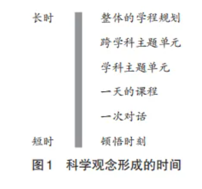 过去,人们在看待科学教学活动时,普遍是一种“结束事件”的教学理解,教学任务完成的标志以“学生掌握了知识或概念”为标准,却忽视了“掌握知识”或“获得概念”向前推进的动力,没有能够引导学生在更大范围内去思考“概念的应用”。而新课标对“科学观念”的强调,实则提示我们:科学观念教学是一种结构化的学程安排,目的是让学生以一种特定的方式来体验世界,并围绕核心概念和跨学科概念,去理解概念与概念之间的关联意义,以及在不同学科之间建立联系,进而感受科学学习的价值。由于学生科学观念的形成要以学科核心概念或跨学科概念学习为基础,要经历持续性的、系列化的进阶学习,因而指向科学观念的教学,就不是以一节课为“结束”标志,而是以“连续性事件”不断地为学生创造“学习期待”。这个过程,可能会在几秒之内完成,也可能要持续几年的时间,科学观念的学习进阶是一个“短时”至“长时”的连续体(见图1)。在“短时”时刻,可被理解为观念的“顿悟”;在“长时”时间上,可被理解为观念深化的“学程”。