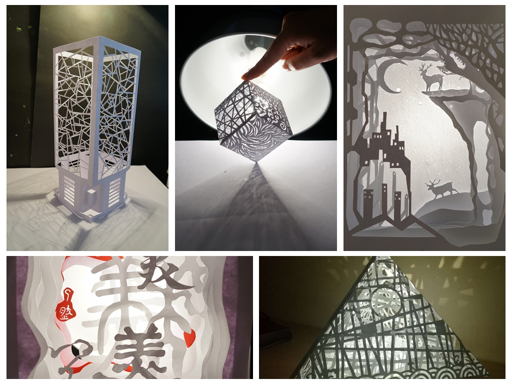 三天的培训学习紧张高效,学员们经历了理论感知——二维立体制作——2.5维立体制作——三维立体制作的学习过程,从最初的茫然懵懂,到结业时的得心应手,信心十足。他们的学习态度空前热情,甚至达到了废寝忘食的状态,最后展示的学习成果令人惊喜。培训作业要求以《传统与现代》为主题,以“西洋镜”或“立柱”的为表现形式,创作一件立体构成作品。作品美仑美奂,每一件作品都凝聚了作者的精巧构思,精湛技艺,让观者感叹:“灵心胜造物,妙手夺天工”!