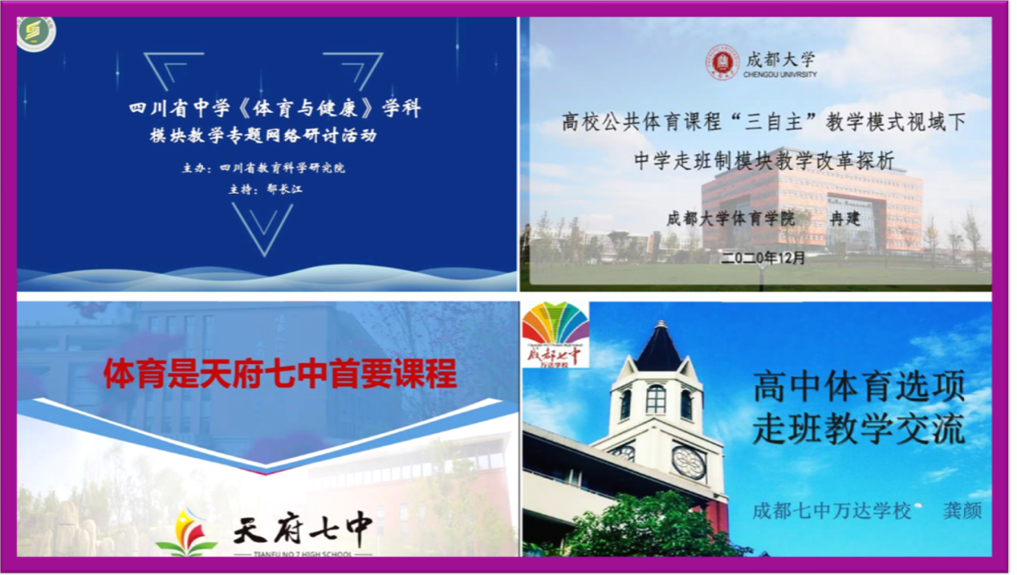 为贯彻落实中共中央办公厅、国务院办公厅印发《关于全面加强和改进新时代学校体育工作的意见》精神,科学谋划学校体育工作,提升学校体育教育教学质量。根据《四川省教育科学研究院办公室关于举办学科教育教学网络研讨活动的通知》要求,2020年12月22日下午,由四川省教育科学研究院主办的“四川省中小学《体育与健康》学科模块教学专题网络研讨活动”顺利开展。活动先由成都七中万达学校龚颜和天府第七中学唐金菊老师分别进行了经验交流,之后由成都大学体育学院院长冉建教授进行点评并做了题为《高校公共体育课程“三自主”教学模式视域下中学走班制模块教学改革探析》的专题讲座,成都市高新区体育教研员鄢长江老师受四川省教科院体育教研员谭步军老师的委托主持本次研讨活动