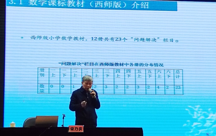 25日下午,西师版小学数学教材主编、西南大学宋乃庆教授作专题报告《西师版小学数学教材促进学生核心素养养成》。宋教授对核心素养的内涵及意义进行了深度解读,阐述了课堂教学中如何结合西师版教材编写特点促进学生的核心素养养成。