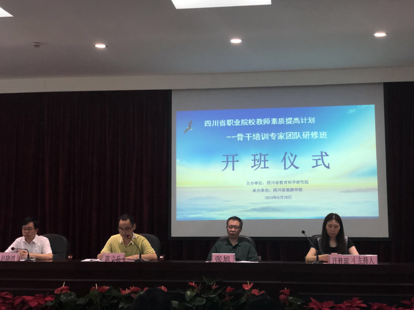 6月20日上午,由省教科院主办的四川省职业院校教师素质提高计划——骨干培训专家团队研修班在四川省旅游学校开班。省教育厅人事教师处副处长张旭、省教科院副院长陈立兵、四川旅游学校校长赵晓鸿等出席开班仪式。