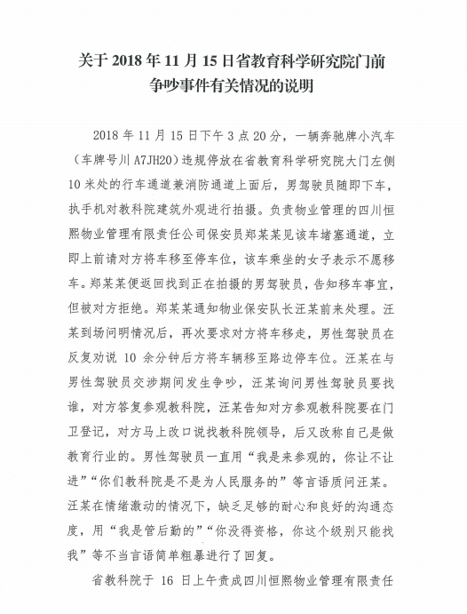 您的位置: 首页 >工作动态>新闻动态>详细内容 新闻动态 四川恒熙物业管理有限责任公司关于2018年11月15日在四川省教科院门前争吵事件有关情况的说明 来源: 发布时间:2018-11-16 16:16:10 浏览次数: 次 【字体:小 大】 分享到: 【打印正文】