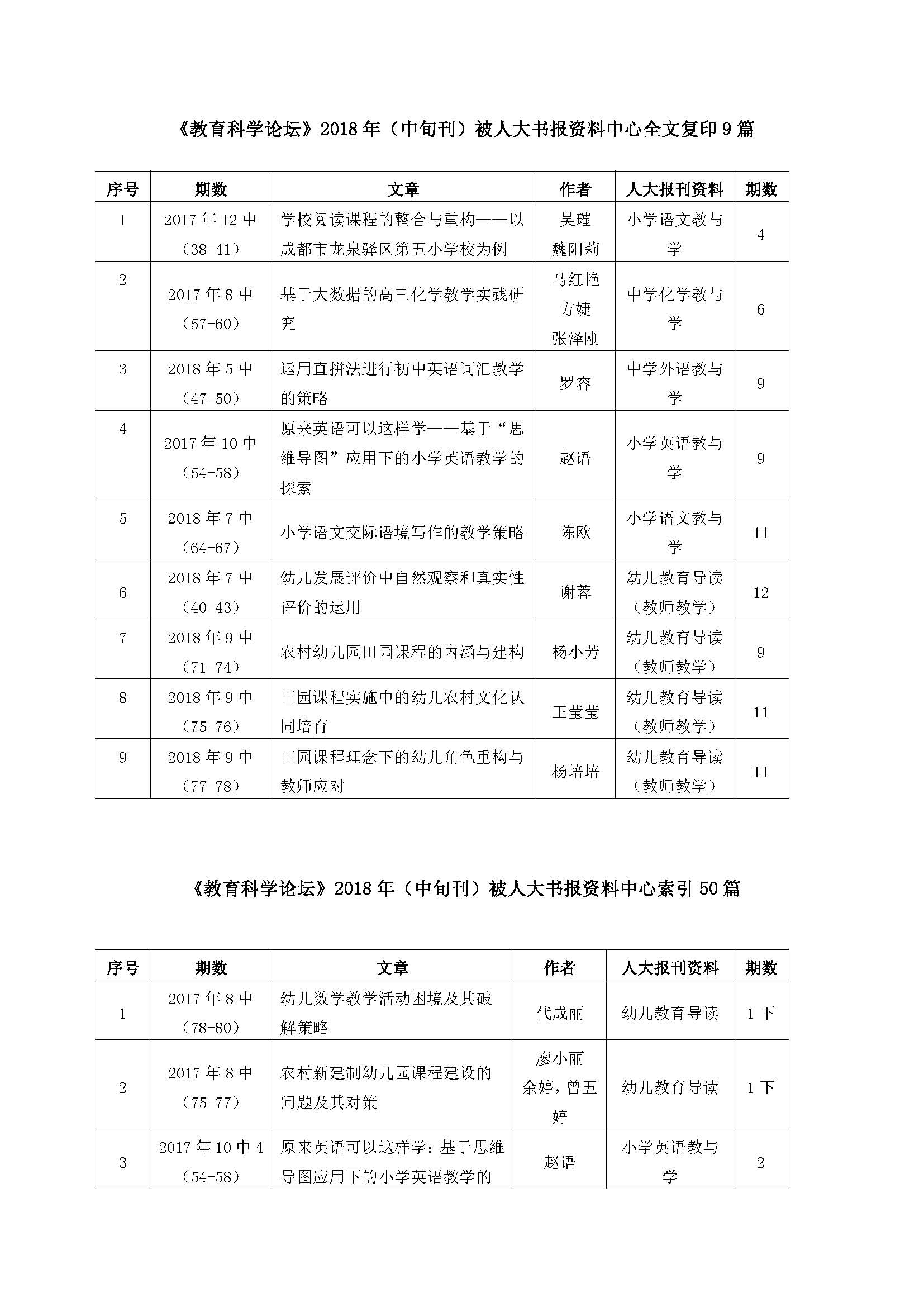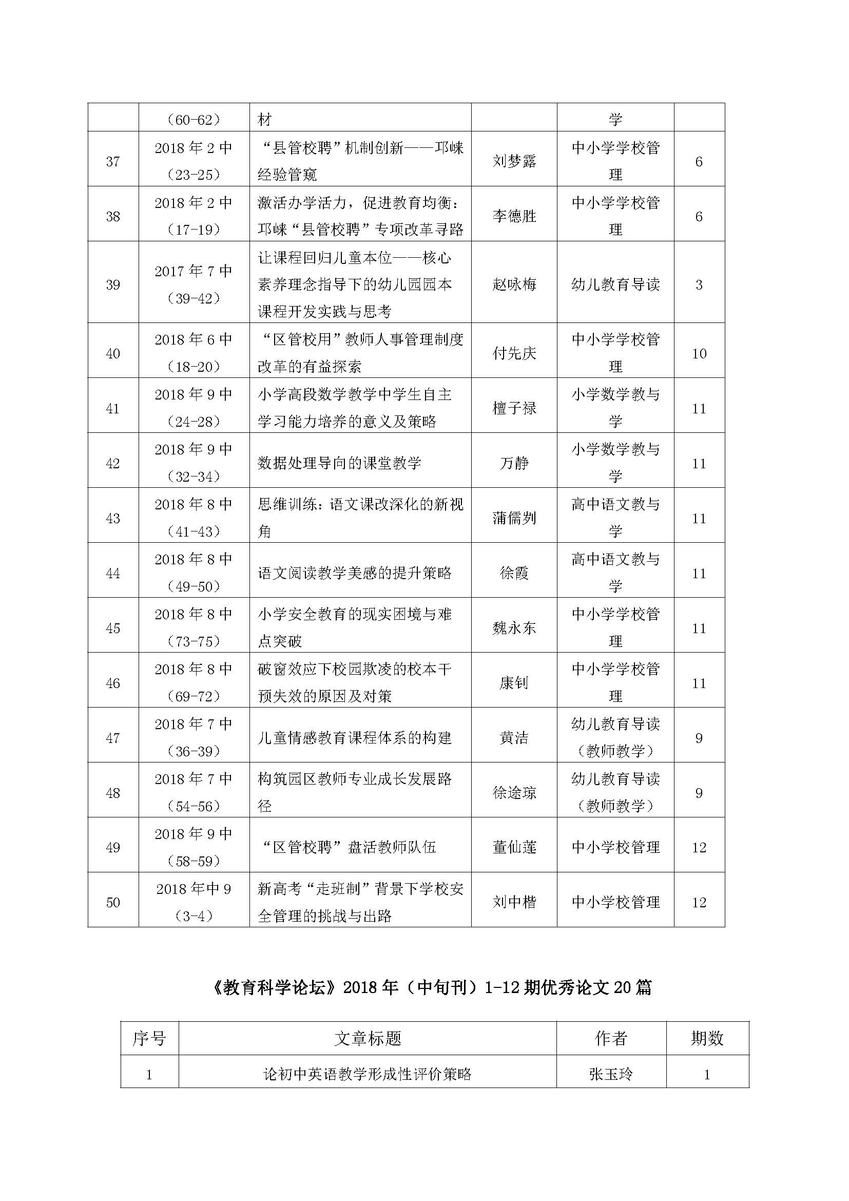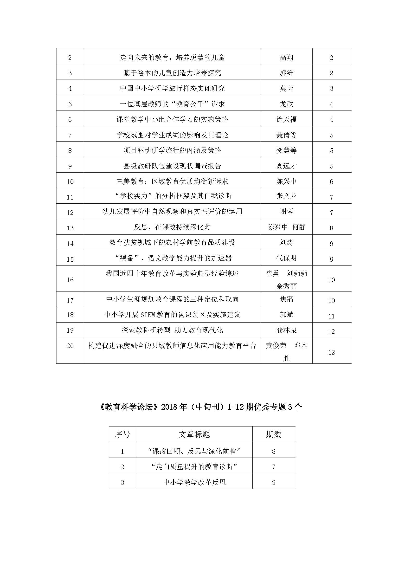 您的位置: 首页 >工作动态>新闻动态>详细内容 新闻动态 2018年《教育科学论坛》人大书报资料中心复印和年度优秀文章汇总 来源: 发布时间:2019-01-03 15:45:20 浏览次数: 次 【字体:小 大】 截至2018年12月31日,《教育科学论坛》2018年文章被人大书报资料中心共计全文复印41篇(已收到样刊35篇),索引105篇。编辑部聘请专家团队评选出年度优秀文章60篇,优秀专题6个。名单如下: 分享到: 【打印正文】
