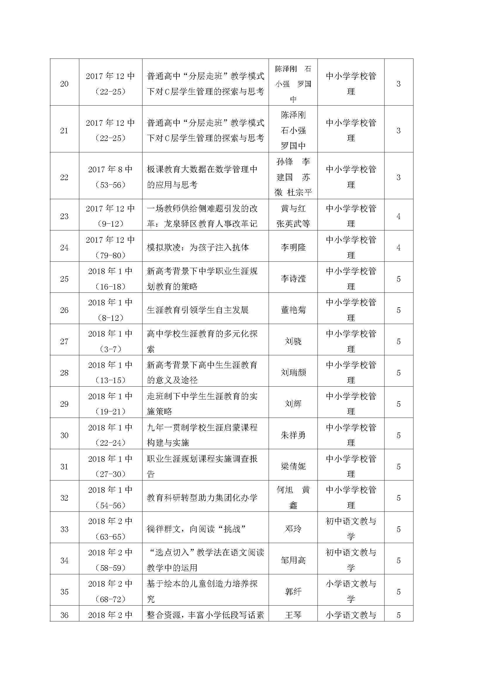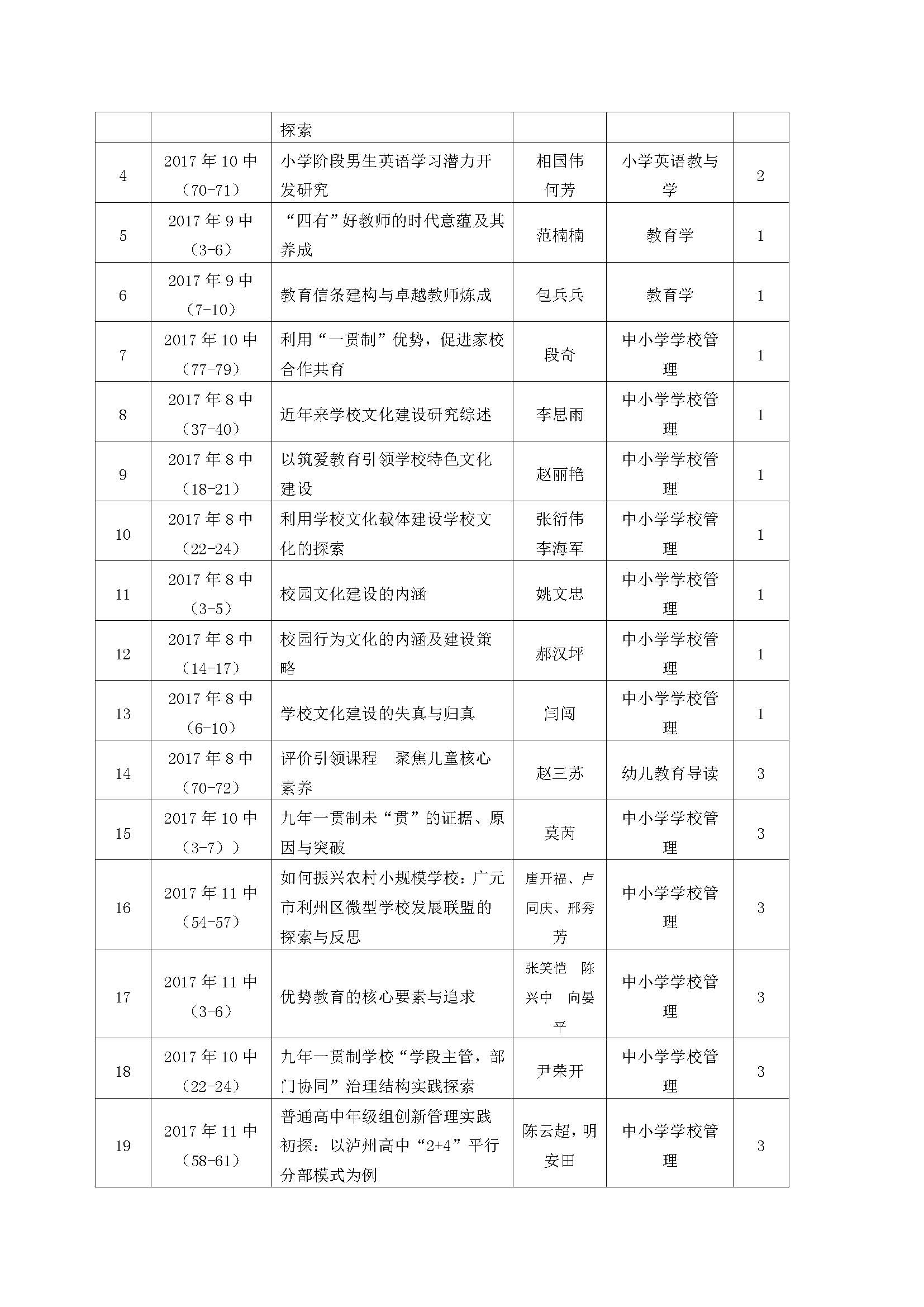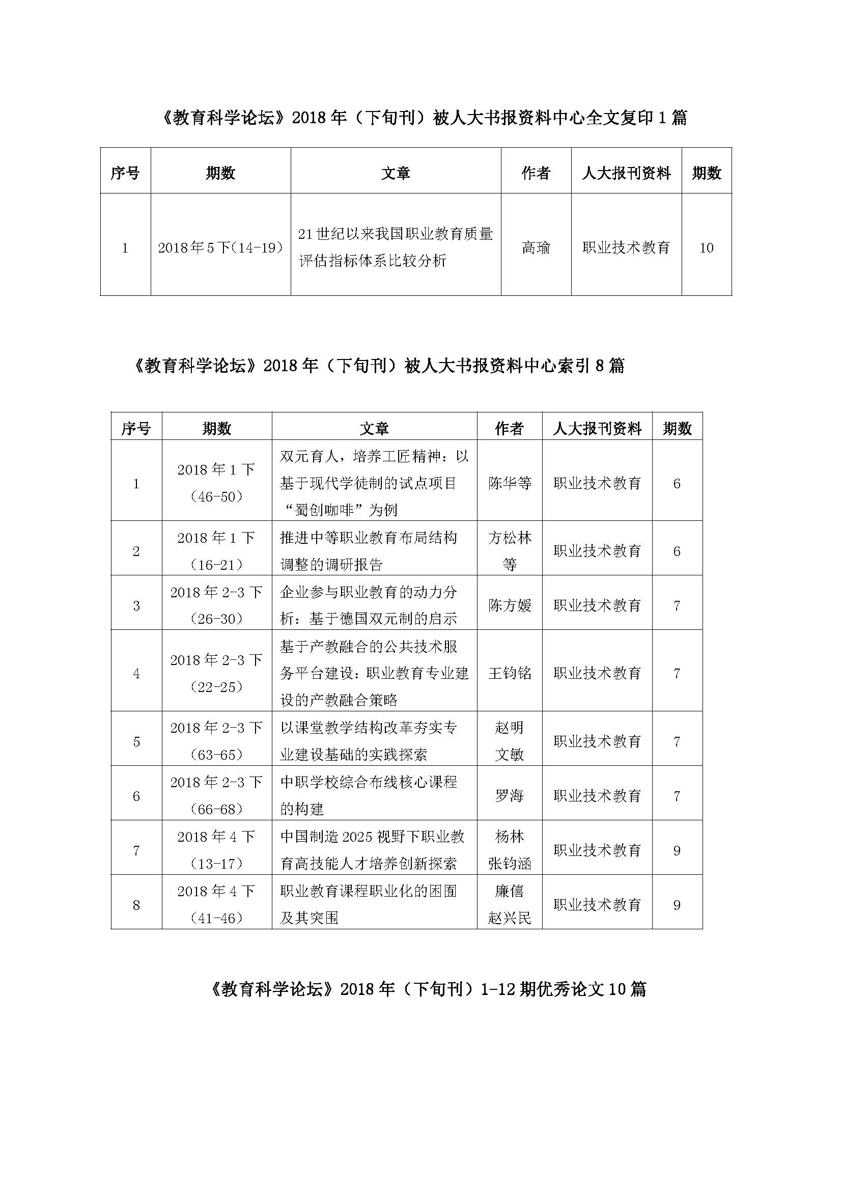 您的位置: 首页 >工作动态>新闻动态>详细内容 新闻动态 2018年《教育科学论坛》人大书报资料中心复印和年度优秀文章汇总 来源: 发布时间:2019-01-03 15:45:20 浏览次数: 次 【字体:小 大】 截至2018年12月31日,《教育科学论坛》2018年文章被人大书报资料中心共计全文复印41篇(已收到样刊35篇),索引105篇。编辑部聘请专家团队评选出年度优秀文章60篇,优秀专题6个。名单如下: 分享到: 【打印正文】