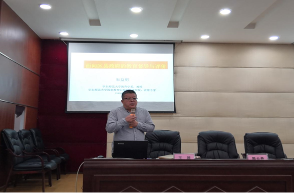 国家教育宏观政策研究院首席专家、华东师范大学博士生导师、朱益明教授应邀做《面向区县政府的教育督导与评价》专题报告。朱教授从落实党中央、国务院优先发展教育事业的高度、系统宏观理论和实践工作相结合的角度回答了当前教育督导要督导什么,怎么督导的问题;进一步明确了当前督导县(区)人民政府履行教育职责的重点,并就如何实施县(区)人民政府教育履职评价、推动县(区)教育改革发展提出了建议。