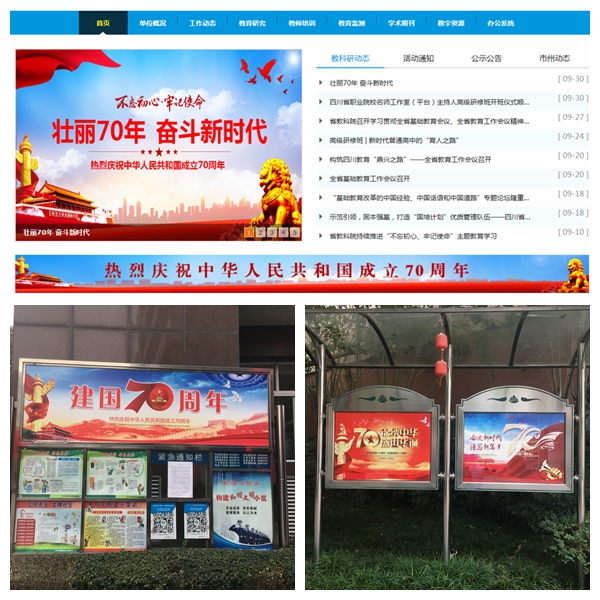 您的位置: 首页 >工作动态>新闻动态>详细内容 新闻动态 我院积极营造庆祝新中国成立70周年浓厚氛围 来源: 发布时间:2019-09-30 22:02:08 浏览次数: 次 【字体:小 大】 为庆祝中华人民共和国成立70周年,营造团结奋进、热烈喜庆的环境氛围,进一步激发全院职工不忘初心、牢记使命、同心共筑中国梦的爱国热情,充分展示全院职工奋进新时代、圆梦新时代的初心力量和使命意识。 院办公室牵头,财资办和物业积极配合,利用院网站、宣传栏、横幅海报等形式,大力气营造浓厚的节日氛围,喜迎新中国成立70周年。 分享到: 【打印正文】