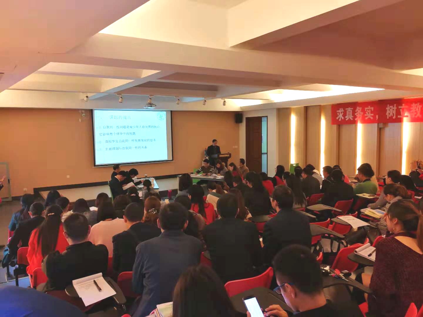 本次会议共三项内容:专题培训、优秀成果展示、现场开题。专题培训提供理论引领,优秀成果展示提供直观的学习资料,现场开题提供教师听讲座之后进行印证、运用的案例。