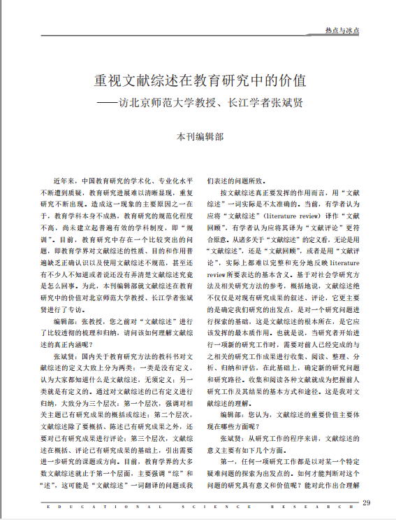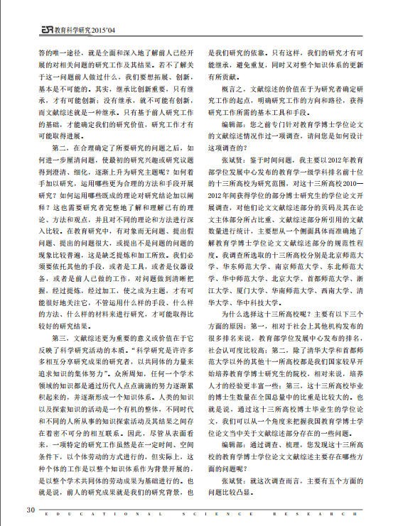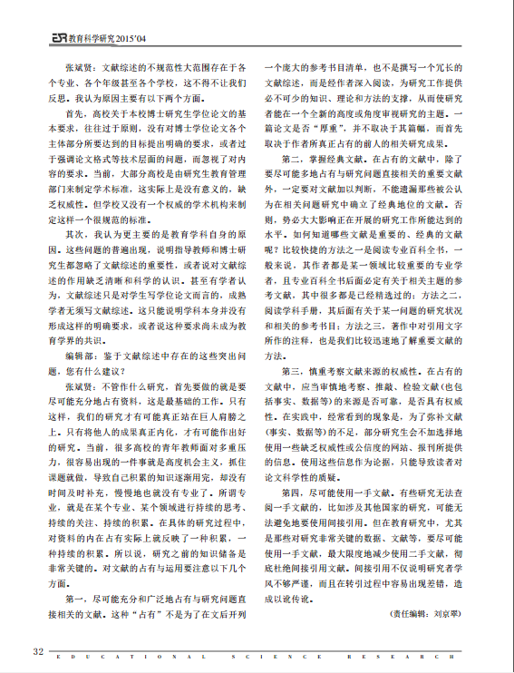 您的位置: 首页 >教育研究>教育科研>学术前沿>详细内容 学术前沿 重视文献综述在教育研究中的价值—访北京师范大学教授、长江学者张斌贤 来源:教育科学研究 发布时间:2016-04-13 16:35:46 浏览次数: 次 【字体:小 大】 相关内容 分享到: 【打印正文】