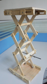 | 设计说明及简单操作说明 | 在教授<<结构的强度与稳定性>>的教学过程中,在某些特定情况下,不稳定型结构可以被应用到我们的生产或生活中,例如不稳定性结构在铁路道口栏杆中的应用,因此设计出该竖直升降平台。旋转螺母平台就可以升降。 | ||||