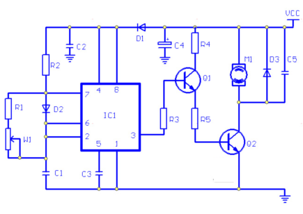 | 简要制作报告 | 一、NE555直流电机脉宽调速电路 原理简要说明:D1用于防止电源接反而损坏NE555,D2、C1、R1、R2、W1、IC1组成脉宽可调的脉冲发生器,调节电位器W1可以使IC1NE555输出的脉冲频率和脉冲宽度改变。输出脉冲经过R3、R4、R5、Q1、Q2驱动调节电机的转速。D3、C5消除电机产生的反电动势,以保护三极管Q3。C2、C4用于电源滤波,C3为稳定基准电压,消除干扰。 | ||||