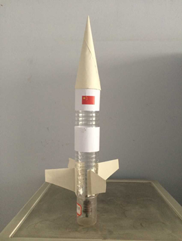 | 设计说明及简单操作说明 | 1、取3个农夫山泉饮料瓶并编号1、2、3,将1号瓶分割成三部分;将瓶口及中段留下; 2、将留下的瓶口及中段,分别套上2号瓶的底部及瓶口,涂上胶水固定。注意:请保持火箭的箭身是一直线; 3、利用厚纸板制作尾翼四片,并将其平均分配固定在火箭的後半部。注意:涂上胶水并确实固定。未平均分配或未固定会影响火箭行进的方向; 4、在外壳上用胶水粘住制作好的五星红旗和其他的装饰,然后套上火箭头及喷嘴,准备展翅高飞了; 5、在发射架上准备发射。 | ||||