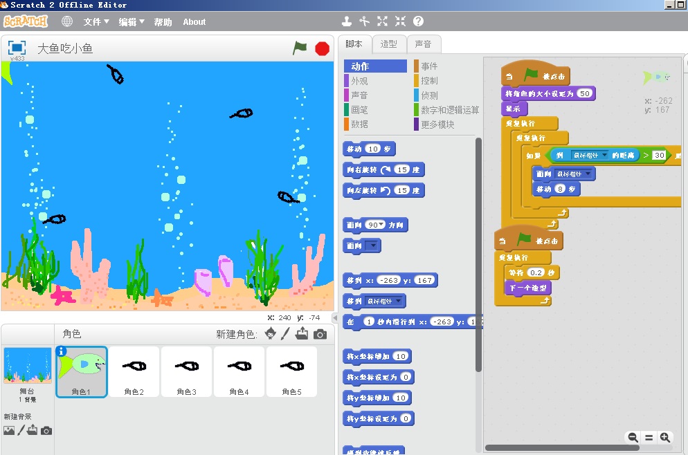 您的位置: 首页 >课程教学>科学教育>技术教育>详细内容 技术教育 Scratch应用游戏《大鱼吃小鱼》 来源:本站原创 发布时间:2016-10-14 16:57:39 浏览次数: 次 【字体:小 大】 /wlhd/2016/10/大鱼吃小鱼.rar爱玩游戏是小学生的天性,通过游戏来激发他们的学习兴趣正是本科的主要目的,通过本节课的游戏制作,学生体会到Scratch中鼠标跟随、随机数命令的作用。 相关内容 分享到: 【打印正文】
