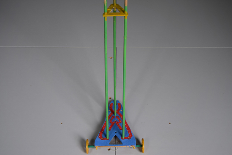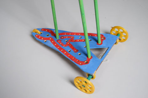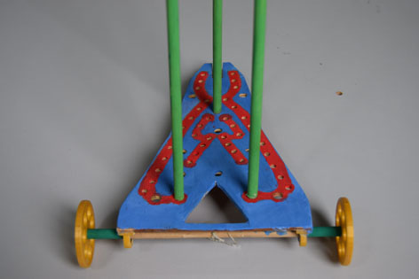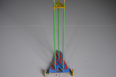 初次试车,小车又跑偏、又侧翻,有左右翻,在第二次制作中加以改造,整体有较大改观。老师帮我们理清原因,我们第二次就顺利多了。因为小车设计有倾角,所以在上坡时会与水平地面接近平行,重物垂直下落,不会偏转。