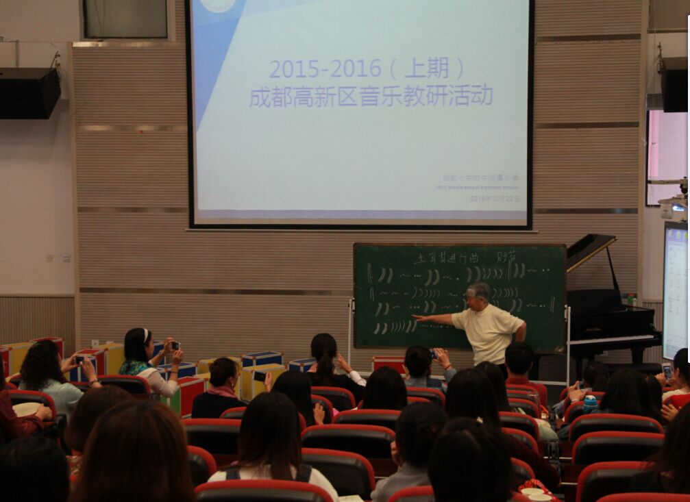 2015年10月22日,2015—2016(上期)高新区第二次音乐教研活动在美丽的成都七中初中附属小学顺利开展并圆满落幕。此次教研活动由高新区音乐教研员万里燕、蒋科组织,并邀请到了中国奥尔夫协会会长李妲娜老师、四川省音乐教研员徐伟老师、四川师范大学副教授王晖老师以及四川省特级音乐教师寇忠泉老师。