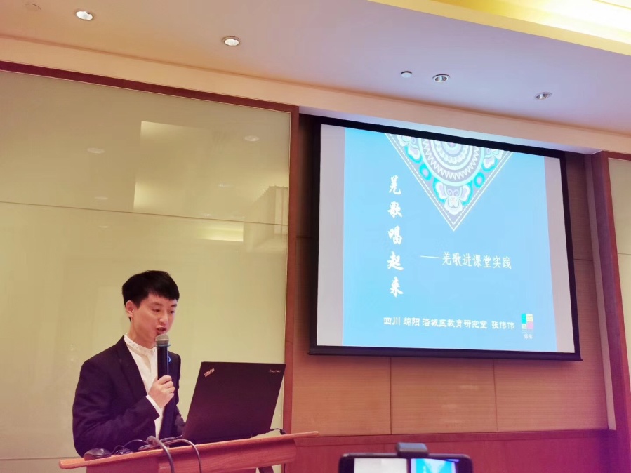 在论文宣读板块,绵阳市涪城区教育研究室音乐教研员张伟《羌歌唱起来——羌歌进课堂》,从羌族民歌艺术特色、羌族音乐在学校的境遇、学校如何教育保护羌族民歌三个方面进行了详细阐述,得到与会老师广泛好评。