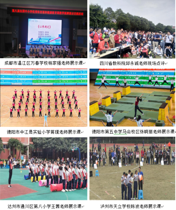 由中国教育学会体育与卫生分会、全国中小学体育教学指导委员会主办的“第八届全国中小学优秀体育课和健康教育课教学展示观摩交流活动”于10月19日至20日,在四川省德阳市外国语学校举行。本次活动共有来自全国顶尖体育教育专家、体育骨干教师、优秀课献课教师等4000余名代表及4120名德阳市优秀学生代表参加。全国有510万名体育教师在线观看了直播。