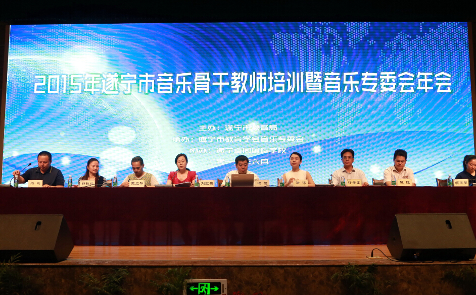 为进一步增强遂宁音乐教学专委会会员间的凝聚力,增进各区县骨干教师间的彼此交流,提升遂宁音乐教师的综合素质与业务水平。6月3日上午,由遂宁市教育局主办、遂宁教育学会音乐专委会承办,遂宁卓同国际学校协办的2015年遂宁市音乐骨干教师培训暨音乐专委会年会在卓同大厅隆重举行。四川省教科所音乐教研员徐伟、遂宁市教育局副局长冯俊、体艺科漆彬、舒艳萍、遂宁市教育学会音乐专委会理事长刘红梅、常务副理事长王应祥、副理事长兼秘书长胡晓琴、卓同教育集团总校长许安富、遂宁卓同国际学校校长陈胜等领导以及来自全市各区县的艺体股长、专干、音乐骨干教师及各级各类学校相关负责人共计400余人参加了此次会议。