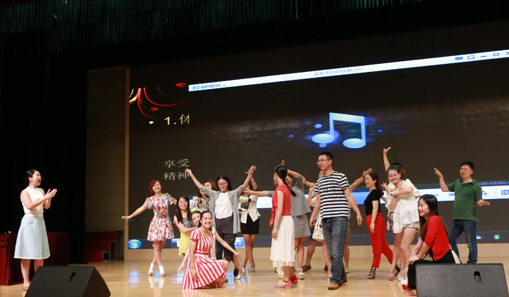 最后,徐伟教研员为现场所有老师们进行了《新课程背景下的中小学音乐教学方法探究》的专题讲座。她以理论学习、案例分析与互动合作的方式,分别就音乐教学目标的设计,音乐教学方法的选择和教学中应该注意的几个问题进行了阐释。并特别强调教学方法中“体验、模仿、探究、合作、综合”这5种常用教学方法的科学使用会让我们事半功倍。她还用情景模拟法邀请现场教师们变身为小学生,与她一起台上台下互动交流,伴随教学活动的深入,整个会场不时传来阵阵欢笑,生动活泼、有趣高效的教学效果就这样直接呈现在卓同大厅上空。