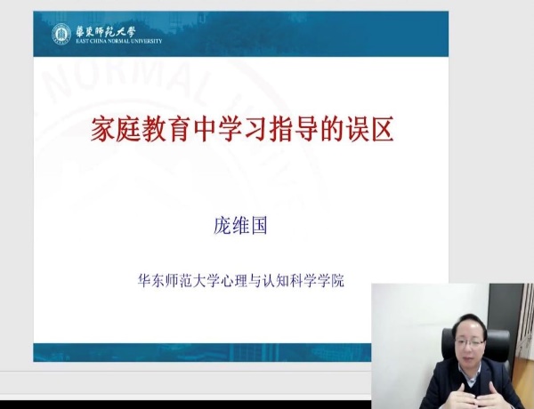 华东师范大学心理与认知科学学院博士生导师庞维国教授进行了“家庭教育中学习指导的误区”专题讲座。庞教授深入剖析了影响孩子学习的内外部因素,明晰了家庭教育中学习指导的误区,强调家长和老师尤其应重视学生智力、学习动机、教学反馈等因素的影响,他通过专业理论与鲜活案例巧妙结合的分析,让线上观众能够更加理性客观地看待学习成绩,运用更加科学有效教育策略,去激发孩子内在的成长动力,引领孩子走向光明的未来。
