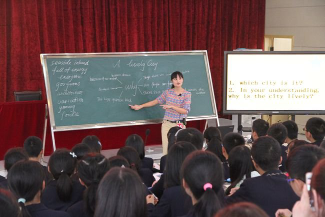 在21日的课堂教学大赛中,我校高2015级蒋沥辉老师参赛题目是《ALivelyCity》。本文是一篇描写厦门的对话性文章,文章记述了小李和马丁从见面到开车穿过厦门整个城市直至海港途中的所见及对话,描述了厦门是一个富有活力又极具魅力的城市。蒋老师从对文章本身的描述和挖掘中寻找到升华点,使得文章及丰满和充满生命力,除了让学生们掌握单词及课文基本内容外,还能引起孩子们的兴趣和思考。文章最后一部分,蒋老师通过提问:“在我们国家,除了厦门,还有许多有魅力的城市?你最喜欢那个城市?并且两三句话总喜欢它的原因。”由此,孩子们进行了激烈的讨论。在听他们的回答时候,蒋老师有意加快了课题节凑,边听取答案边在黑板上写出了大家喜欢的形式,最后出其不意的在黑板上用城市名字构成了一个心的形状。加深之前有意设计的“I”和“China”这两个单词,构成“我爱中国”的一个大图标。由此提问孩子们对于自己的家乡和祖国,我们可以做点什么,使之更美好。引起孩子们强烈的共鸣和思考。最终蒋沥辉老师获得第九届全国高中英语教师基本功大赛“一等奖”及“最佳课堂教学组织奖”。