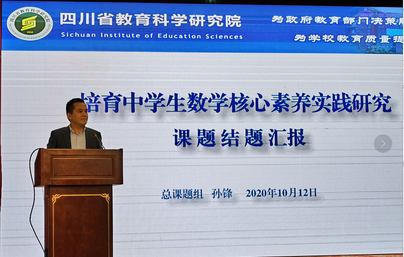 活动首先由课题负责人四川省教科院中学数学教研员孙锋作了《培育中学生数学核心素养实践研究》课题结题报告,详细介绍了课题研究的背景、意义、研究过程、研究成果、研究组织结构等。课题建立以省级教研视域下的全体参与,以点面结合的市、区(县)、校的子课题校的立体研究架构,其中以绵阳市为市级代表全域参研,以泸县为区(县)代表,以泸州高中、资阳中学、棠湖外国语学校、玉林中学为学校代表参研。课题以高中六大核心素养实行“结构化研究,体系化建构”的研究思路,通过近4年的研究取得了丰硕的成果:出版《培育中学生数学核心素养的策略与实践》专著1本(相关著作8本);省级以上刊物公开发表文章32篇(3篇核心期刊);省级期刊专栏一组;省、市级以上论文获奖37篇;课堂教学案例集3本;省级专题展示课40节(覆盖20个市(洲))。